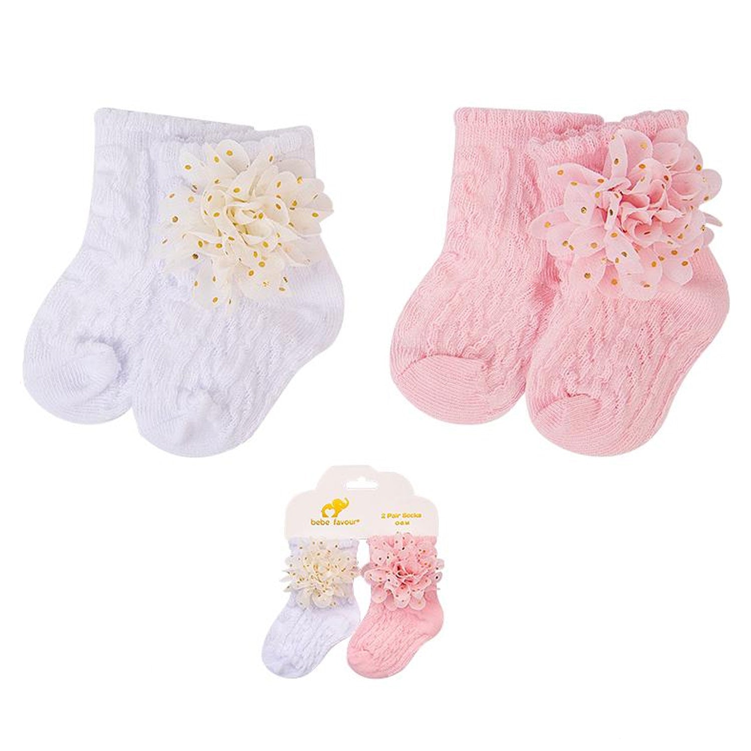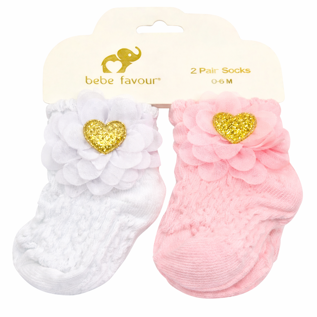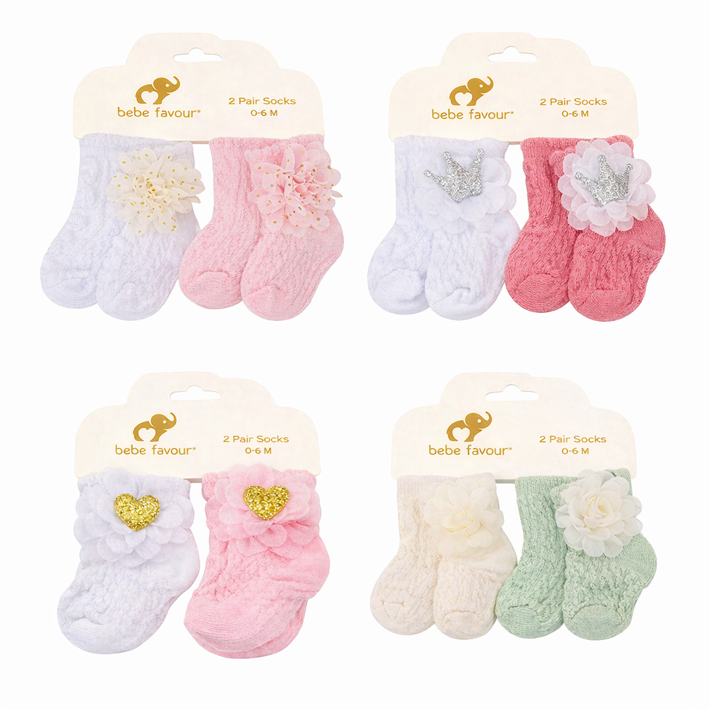 Estas hermosas medias Bebe Favour vienen en set de 2 pares y están diseñadas especialmente para recién nacidos y bebés de 0 a 6 meses.